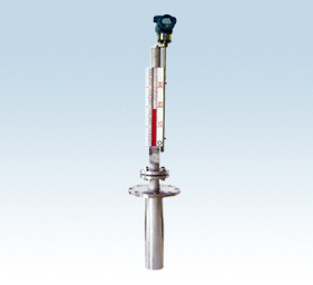 該產品由本體(由上、下導管組成)、翻板箱(由紅、白雙色磁性小翻板組成)、浮子(由磁體、頂桿、浮筒 組成)、以及液位變送器等組成,其結構如圖所示。工作原理為:容器內的浮筒(按不同介質和壓力針對研制), 在下導管中隨液面高度的變化而上下浮動并通過頂桿使磁體在上導管內上下移動,促使本體外的翻板翻動 并顯示紅、白顏色來指示液面高度,同時液位變送器將液位信號傳送至控制中心進行液位指示和控制,也 可通過計算機進行集中監控。