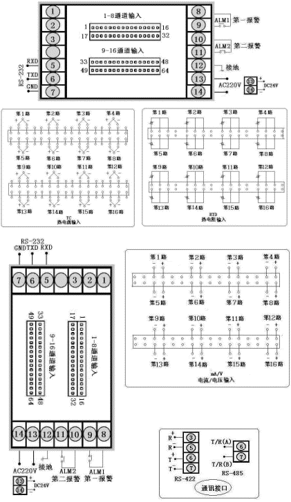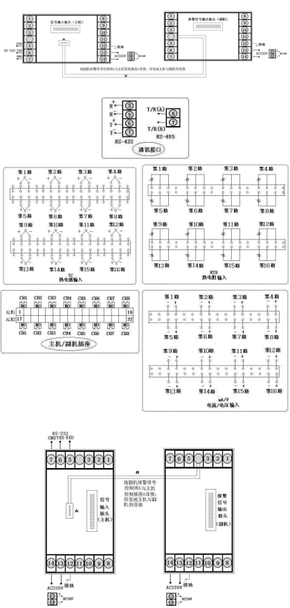 十六路巡檢統一控制/報警輸出,通訊方式為RS485,輸出方式為繼電器輸出,輸入類型為CU50,y.i報警為下限報警,第二報警為上限報警,AC90~265V供電,豎表。