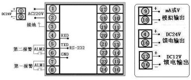 輸出方式 | 01234567 | 無控制輸出繼電器觸點電流 4~20mA電流 0~10mA電壓 1~5V電壓 0~5VSCR-過零觸發脈沖SSR-固態繼電器 | |||||||||
