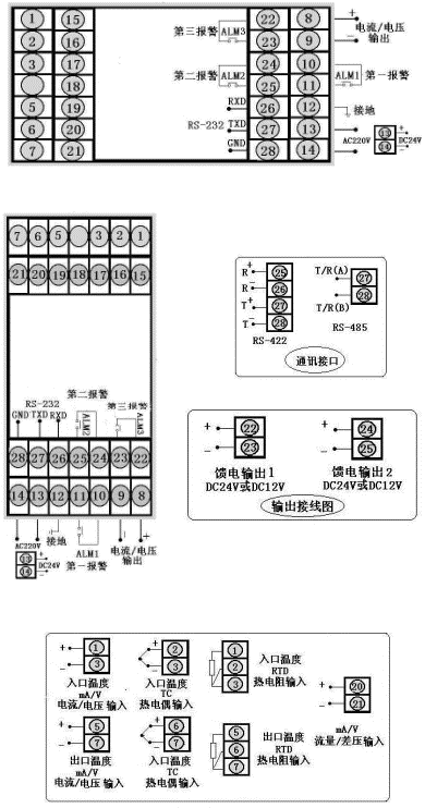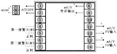 輸出方式為繼電器正反轉輸出,PV輸入類型為4~20 mA,SV輸入類型1~5 V,DC24V供電。