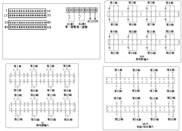 十六路巡檢統一控制/報警輸出,通訊方式RS485,繼電器輸出,輸入類型CU50,y.i報警為下限報警,第二報警為上限報警,不帶報警記憶功能,AC90~265V供電。
